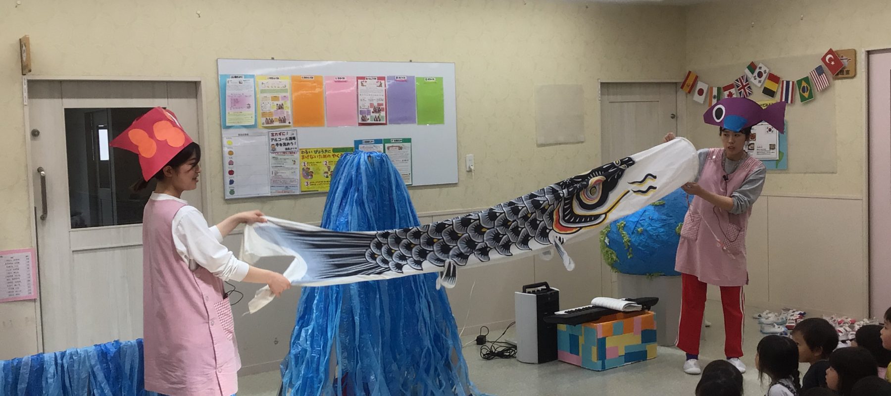 4月27日こいのぼり会がありました。先生達からの劇でこいのぼりの由来を知ったり、柏餅やしょうぶ湯のクイズで盛り上がりました。