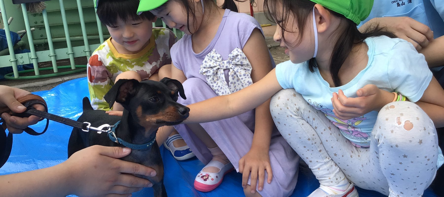 今日は近隣の学校の中央動物専門学校の犬と学生さんが園に来て、5歳のめろん組さんが交流参加しました。