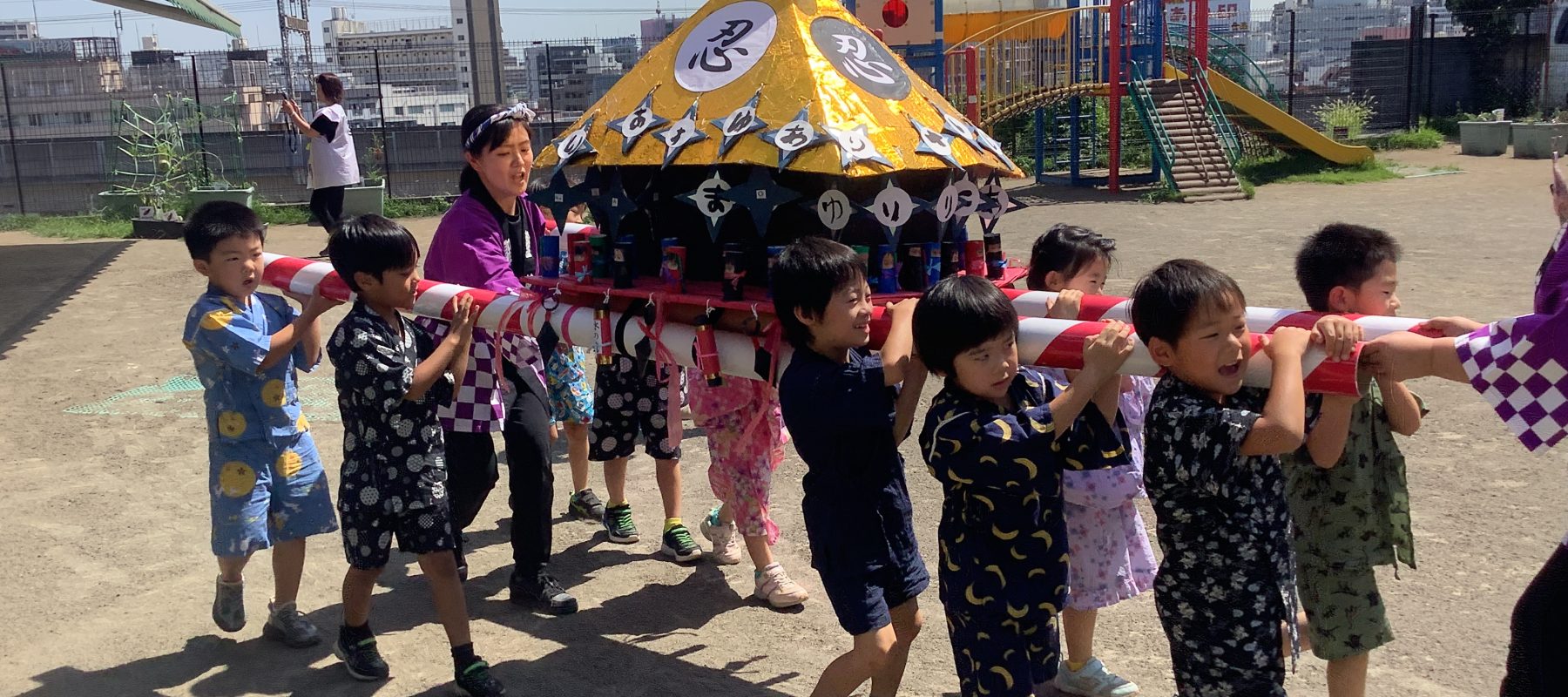 田端聖華保育園の夏まつりが始まりました。オープニングはめろん組5歳児クラスのおみこしです。子ども達が一生懸命作ったおみこしと、5歳児クラスのわっしょい!!わっしょい!!の大きなかけ声がとってもカッコ良く、他クラスの園児もめろん組さんのかけ声に合わせてわっしょい!わっしょい!と声を出し、盛大なオープニングとなりました。
