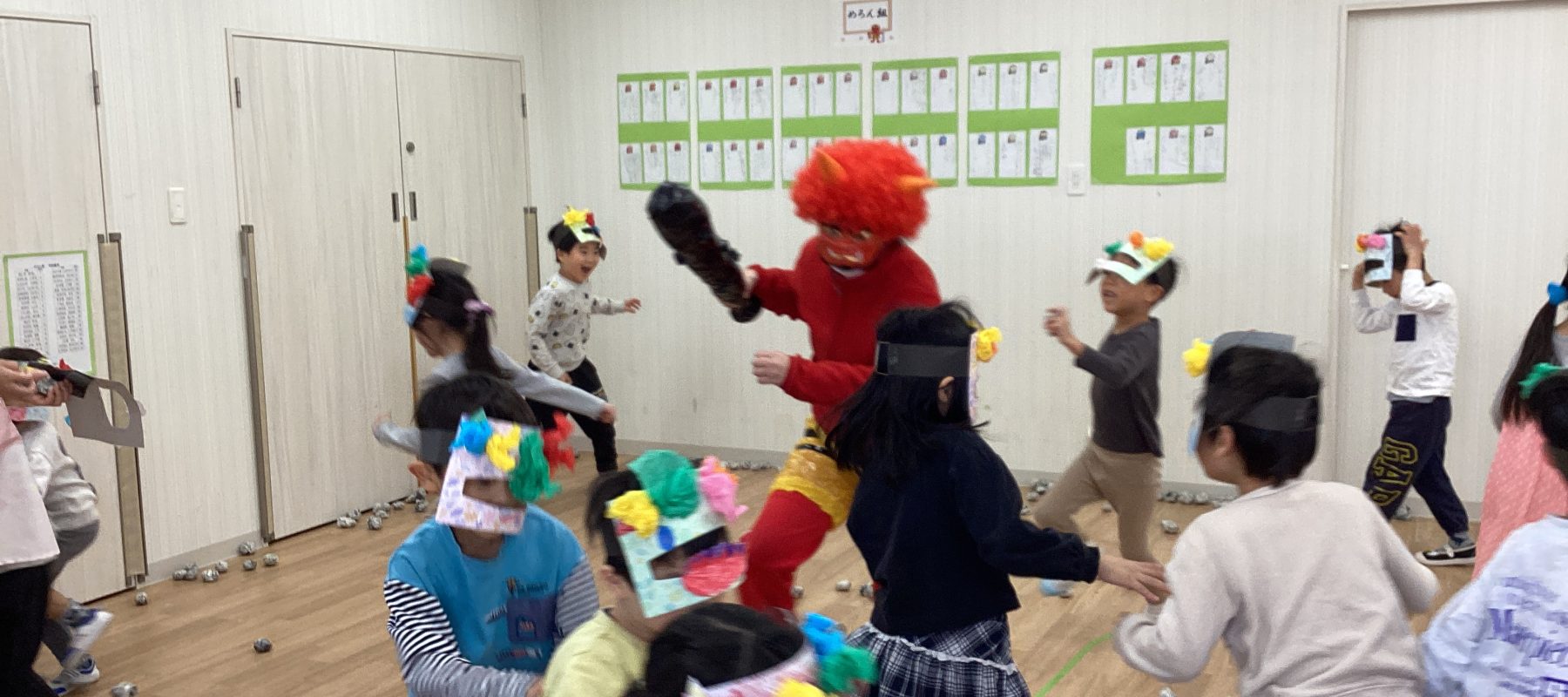 5歳児クラスは最後にサプライズで先生鬼が登場し、皆で力を合わせて先生鬼を退治することが出来ました。