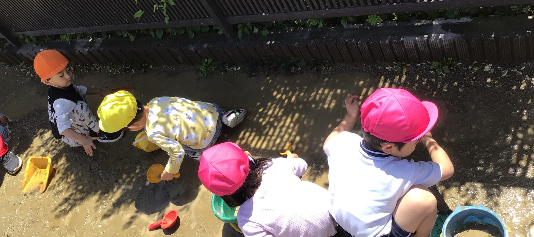 昨日の雨の影響で園庭に水たまりができていると、中に入ってみたり、シャベルで水をすくって集めたりと、