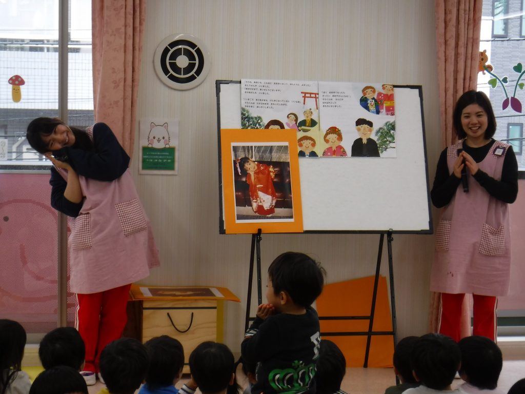 今日は『七五三』のお祝いがありました。保育士から七五三の由来のお話をしたり、七五三のクイズを出しました。クイズは、職員の子ども時代の七五三の写真を見せて、だれなのかを当てるものでした。