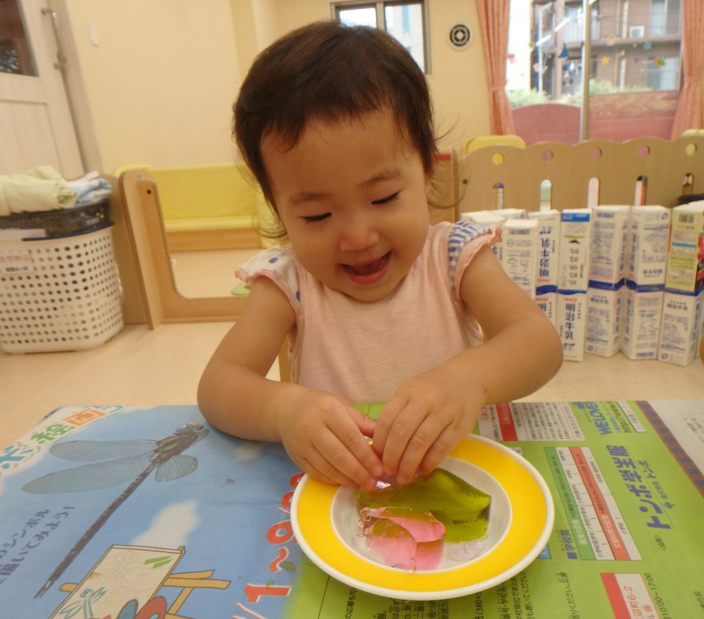 台風などで雨の日が続いて、水遊びがなかなかできない時は、室内でも寒天遊びなどを行っています。キラキラした色とりどりの寒天に子どもたちは興味津々。積極的にどんどん触ってみる子や、恐る恐る触ってみる子、それぞれひんやりと冷たい感触を楽しんでいました。