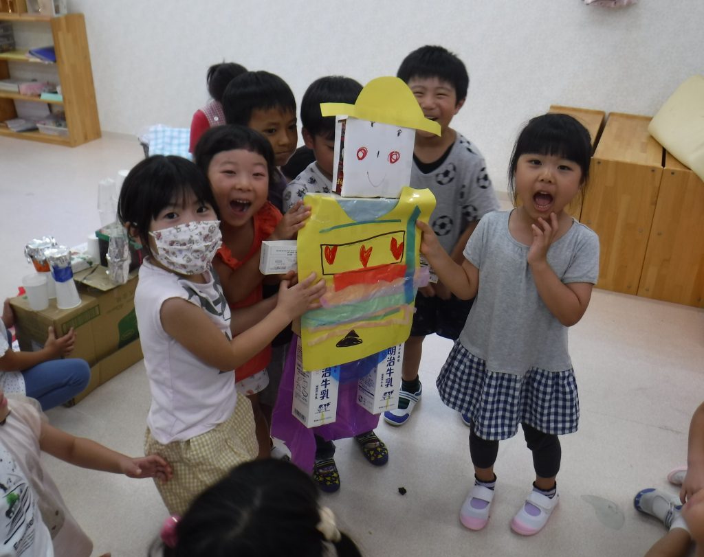 5歳児めろん組がグループごとに製作をしました。それぞれのグループで、作るものと、役割分担などを話し合い、力を合わせて作り上げました。廃材や様々な素材も使って、自由な発想で作られた作品たちは、どれも力作ばかりで、いまにも動き出しそうです!完成した後は、グループで発表もしました。こだわったポイントなどを発表する表情は、達成感であふれていました。作った作品で遊んでもいいことになっているのですが、みんな思い入れがあるようで、大切に大切にお部屋に飾られています。