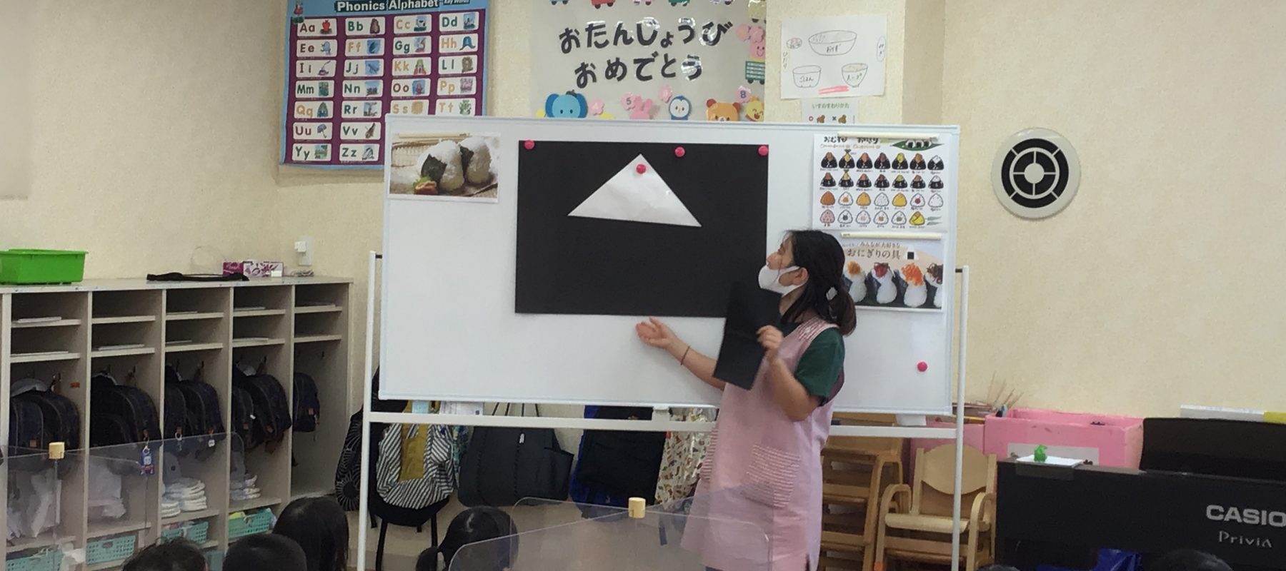 りんご組では折り紙で「おにぎり作り」を始めました。「おにぎりの中身」の話が止まらず「しゃけ!シーチキン!こんぶ!」「ママが作ってくれた!」「お出かけした時に買った」などなど折り紙を折るまで子どもたちの気持はおにぎりでいっぱいです。説明を聞きながら、楽しく折ることができました。