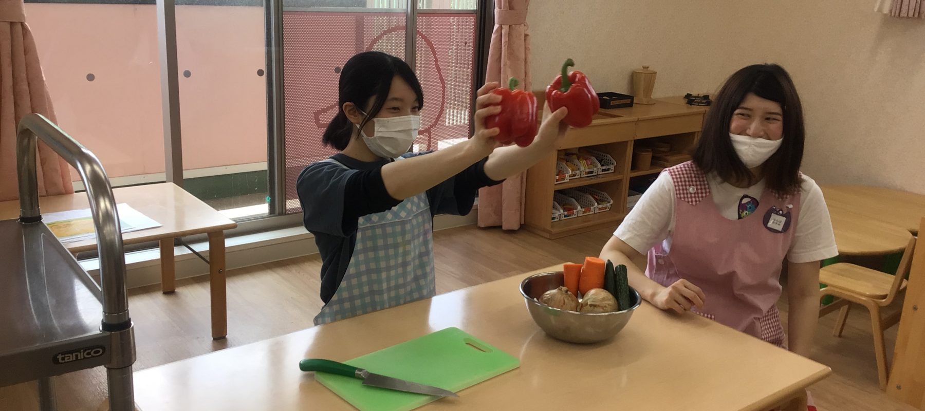 ぶどう組での食育です。「パプリカ・たまねぎ・にんじん・きゅうり」いつ食べている当たり前の野菜に切り口はいったいどうなっているのかな?子どもたちの回答も飛び交い「へぇ~こうなっているんだ」と「種がすごい!」子どもたちの回答に栄養士も微笑む場面もありました。切り方の違いで「初めてみた!」と感動する場面もありました。