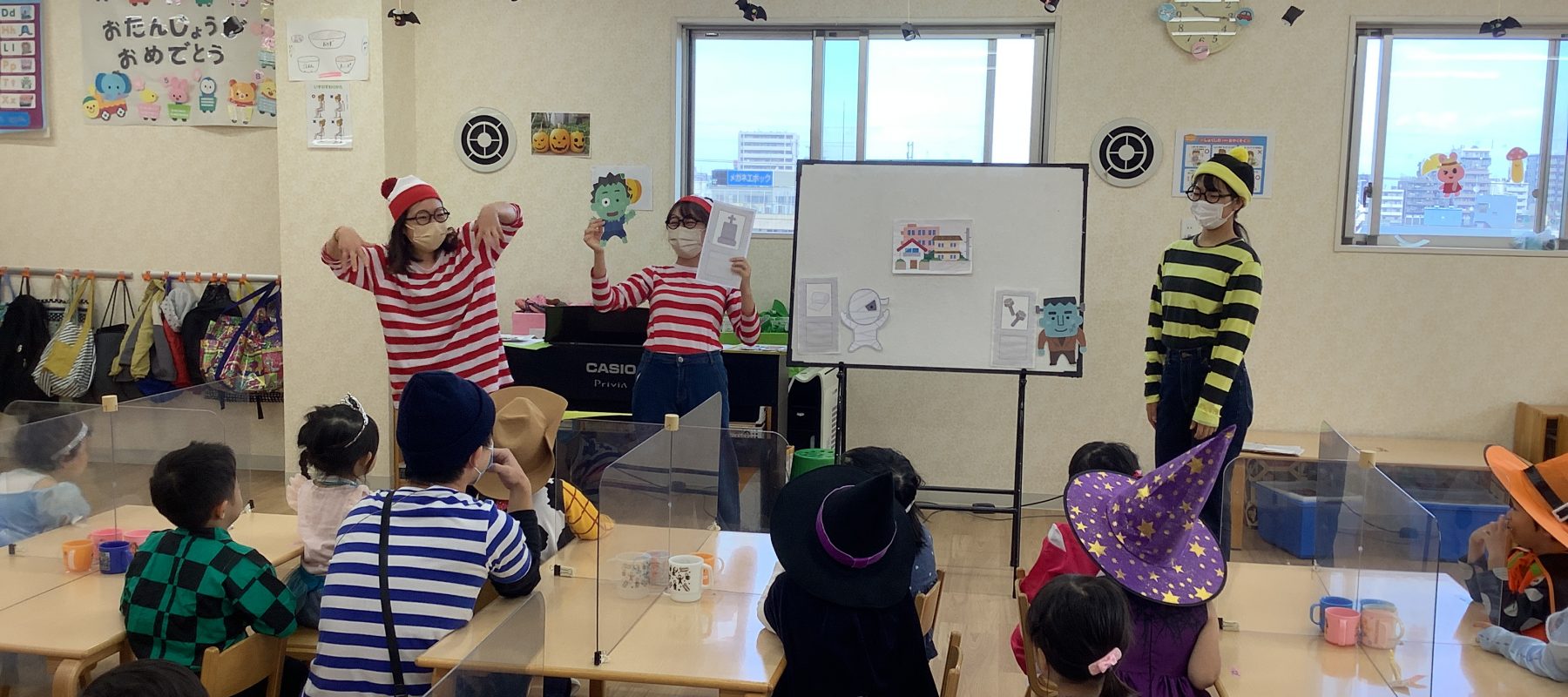 会ではコーナーに分かれて、Halloweenの由来、トリックオアトリート、ダンス、ぬりえ、ファッションショーに分かれて参加しました。