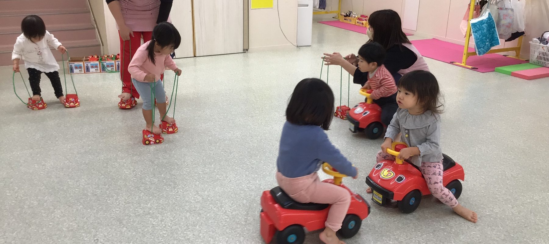 1歳児みかん組です。お部屋とエントランスに分かれて遊びました。バランス感覚高度な「ぽっくり」にも挑戦です。回数を重ねるごとにバランス感覚を養い、コツをつかみとても上手になりました。