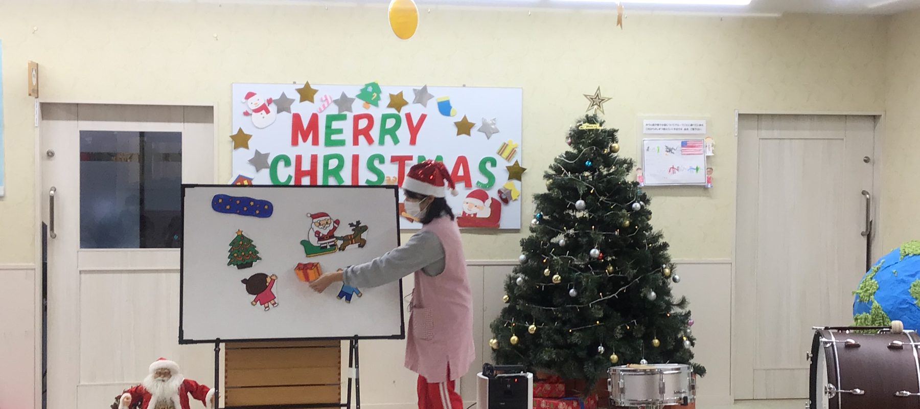 クリスマス会がありました。1部、2部にわかれ5歳、4歳の発表で楽しい会が始まりました。「あわてんぼうのサンタクロース」の曲に合わせて、子どもたちも歌いながらパネルシアターを楽しみました。