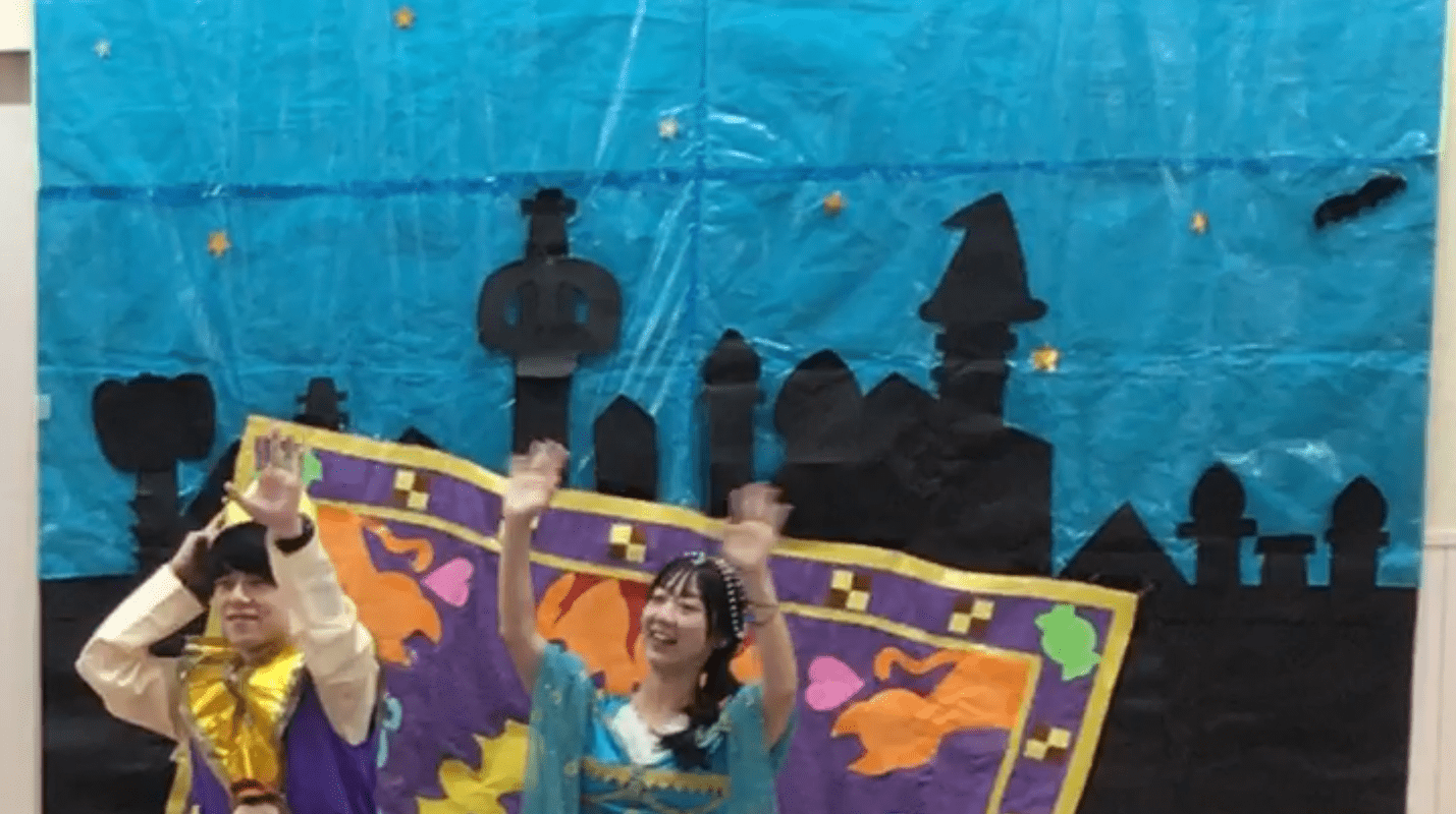 ハロウィンの由来やお菓子のもらい方(Trick or treat!)を知る劇にもアラジンやジャスミン、ジーニーやジャファーが登場し盛り上がりました。