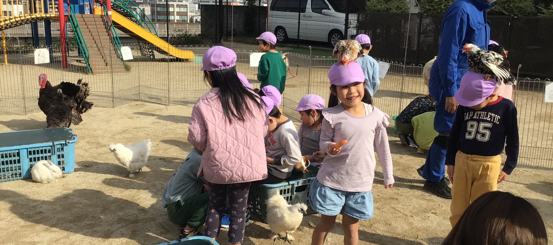 お天気が心配でしたが、無事に保育園に動物村がやってきました。園庭が動物たちで賑やかになり、ニワトリを頭に乗せたり、ウサギを抱っこしたりと柵の中に入り、動物たちとたくさん触れ合っていました。