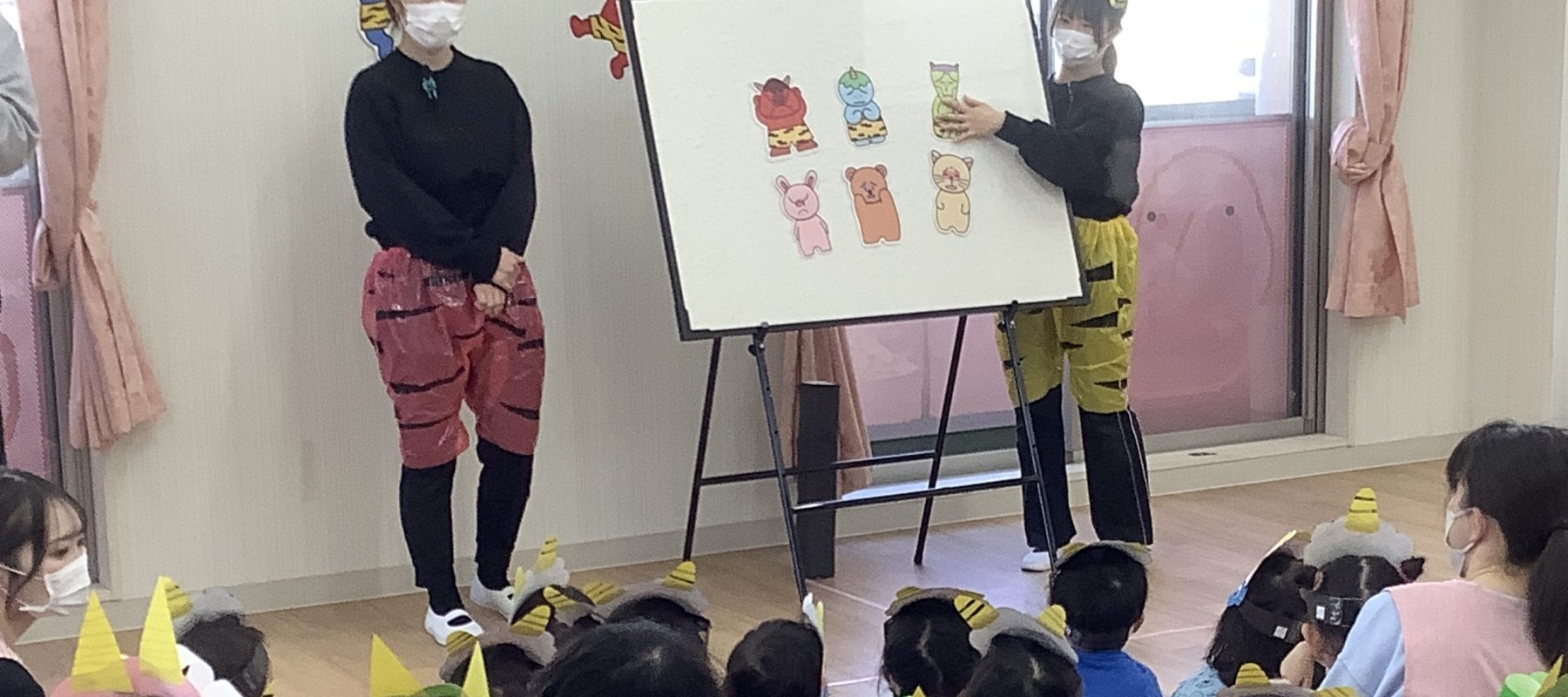 1月8日に新年子ども会を行いました。 子どもたちは新年の挨拶をし、お正月遊びの紹介や十二支のお話のパネルシアターを見ました。 最後にエントランスに飾ってあった獅子舞を紹介して、噛まれることで一年元気に過ごせることを伝えました。