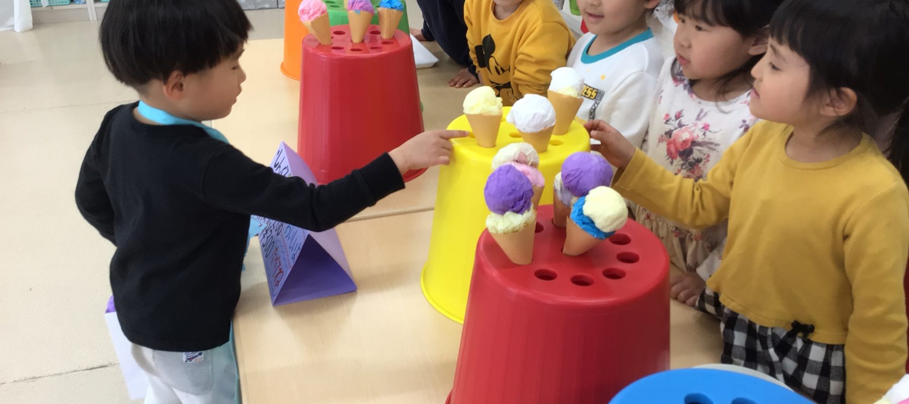 アイスクリーム屋・時計屋・クレープ屋・お花屋さんがオープン!お金に見立てた手作りの100円玉を使ってお店屋さんとお客さんのやりとりをして楽しみました。